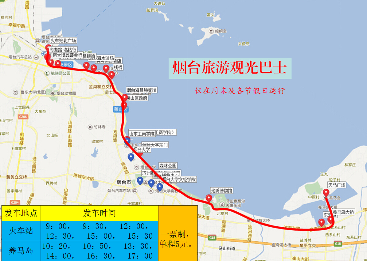 线路简介: 火车站北广场首班车时间9:00,养马岛末班车时间17:00。旅游观光线路仅在节假日及休息日运行。