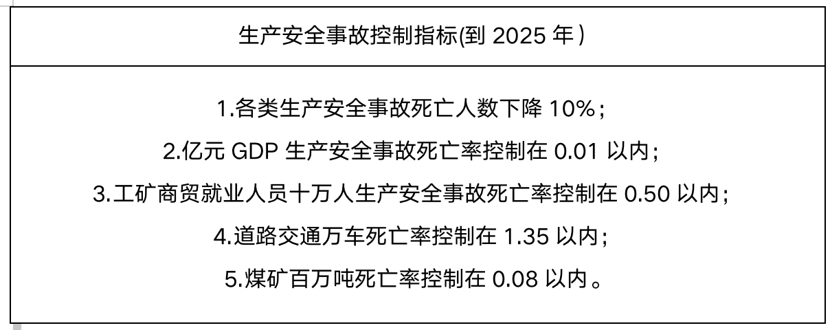 1.总体目标。到2025年,安全生产治理体系和治理能力现代化建设取得重大进展,安全生产监管执法和事故应急救援能力显著增强,安全生产专项整治取得明显成效,重点行业领域安全生产状况有效改善,本质安全水平显著提升,安全生产事故总量进一步下降,较大事故得到有效遏制,杜绝重特大事故,全市安全生产事故风险防控水平和全民安全素质显著提升,安全生产形势趋稳向好,人民群众安全感明显增强。
