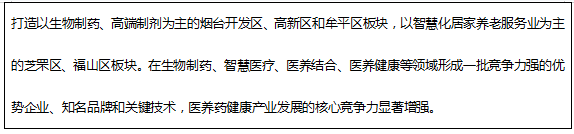 ——医养健康产业持续健康发展。医养健康产业成为全市新旧动能转换重点培育的优势产业。2019年,生物医药产业集群成功入选全国首批战略性新兴产业集群,医药健康产业集群入选山东省首批“十强”产业“雁阵型”集群库。2020年全市医养健康产业集群营业收入达到1230亿元,对全市经济发展贡献日趋显著。