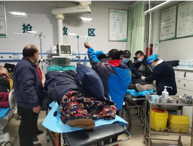 “元旦那天,我上白班,从早晨7:00多到岗,一直到晚上6:00回家,十几个小时没吃饭没喝水,竟然一点也没觉得饿和渴,回到家只想着躺下。”曲绍霞是一名急诊科医生,也正在“阳康”之路上,上白班的她本可以中午回家吃饭休息的,但是看着一个接一个的病人络绎不绝紧急入院,她认为自己不能走,所以主动放弃了“时间概念”,一心投入到接诊中。连续十几个小时的工作强度,疲乏无力加上时不时的咳嗽,让她感觉到了前所未有的疲惫。“元旦这天我们接诊了100多位病人,最小年龄72岁,最大102岁,全是高龄老人,全是重症,收入院50多人,不能看着老人遭罪,尽快安排住院,尽快治疗,减轻他们的痛苦是我们当下所要做到的最好的服务,无论是病人、家属还是医护人员,大家都太不容易了。坚持一下,医护患紧密配合,相信很快就好了。”据曲绍霞介绍,元旦的急诊科根本就没有插脚之地,其中一位老人入院时呼吸停止,刻不容缓,他们毫不犹豫就在护士分诊台上实施了紧急抢救。