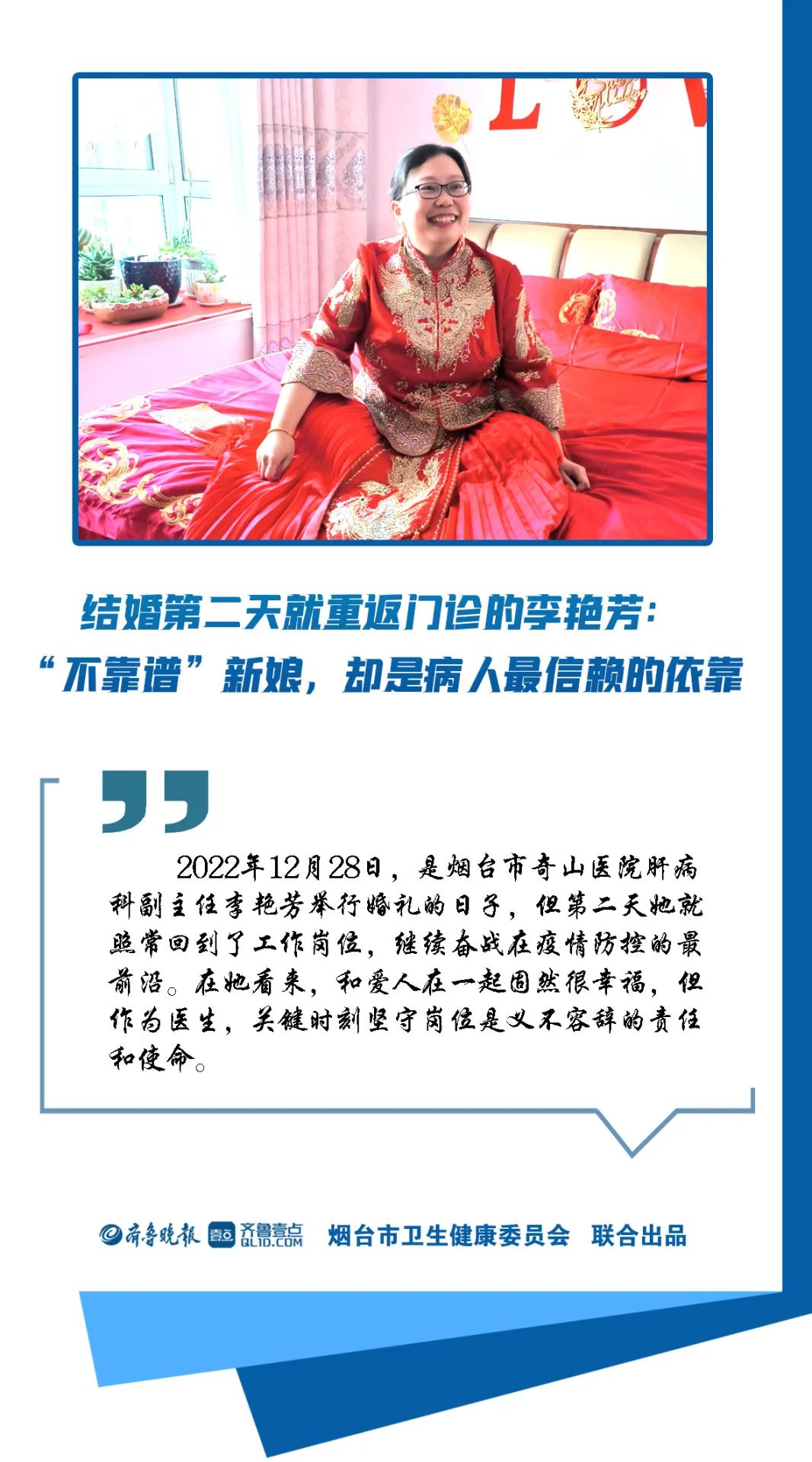 在爱人眼里,她未必是最“靠谱”的新娘。但在病人眼里,她却是最值得信赖的守护者。2022年12月28日,是十大正规的赌网正版奇山医院肝病科副主任李艳芳举行婚礼的日子,但第二天她就照常回到了工作岗位,继续奋战在最前沿。在她看来,和爱人在一起固然很幸福,但作为医生,关键时刻坚守岗位是义不容辞的责任和使命。
