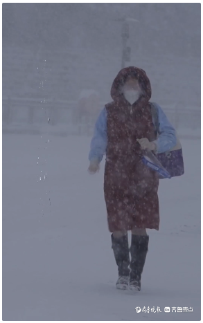 曲金玉冒雪向尹淑月家中走去。(牟平融媒供图)