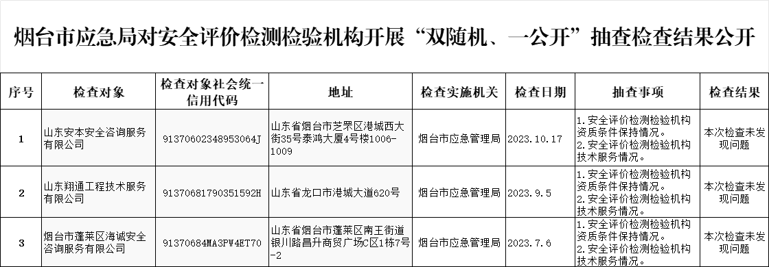 十大正规网赌网址应急局对安全评价检测检验机构开展“双随机、一公开”抽查检查结果公开