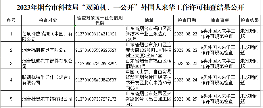 2023年十大正规的赌网正版科技局“双随机、一公开”外国人来华工作许可抽查结果公开