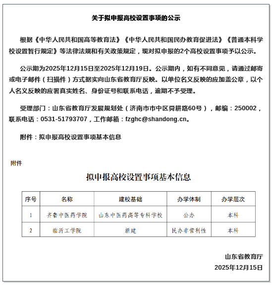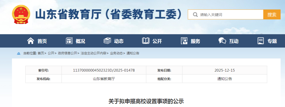 12月15日,山东省教育厅发布《关于拟申报高校设置事项的公示》。