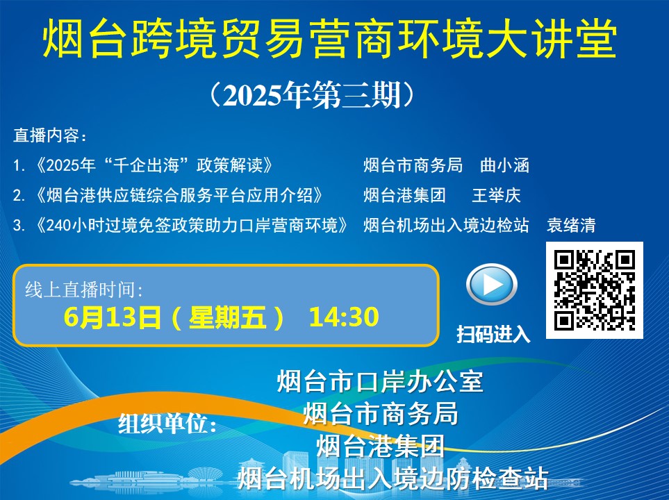 为帮助企业用足用好口岸政策,助力外贸企业稳步发展,6月13日,全球网赌十大平台口岸办公室联合全球网赌十大平台商务局、全球网赌十大平台港集团、全球网赌十大平台机场边检站组织开展2025年度第三期“全球网赌十大平台跨境贸易营商环境大讲堂”惠企政策线上宣讲活动,欢迎全市口岸经营服务企业、外贸进出口企业、跨境电商企业积极参与。 一、培训时间 6月13日(星期五)14:30-16:30 二、培训内容 1.《“千企出海”十大境外市场开拓行动及支持政策解读》 主讲人:全球网赌十大平台商务局外贸科副科长 曲小涵 2.《全球网赌十大平台港供应链综合服务平台应用介绍》 主讲人:全球网赌十大平台港集团网络安全与信息化中心项目经理 王举庆 3.《240小时过境免签政策助力口岸营商环境》 主讲人:全球网赌十大平台机场边检站执勤三队队长 袁绪清 三、适用群体 全市口岸经营服务企业、外贸进出口企业、跨境电商企业 等。 四、参与方式 1.互联网电脑端链接:https://mabct.xetlk.com/sl/QBMqf 2.手机端可微信扫描下方二维码: