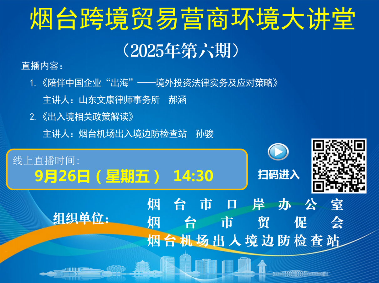 为帮助企业用足用好口岸政策,助力外贸企业稳步发展,9月26日十大正规的赌网正版口岸办公室联合十大正规的赌网正版贸促会、全球网赌十大平台机场出入境边防检查站组织开展2025年度第六期“全球网赌十大平台跨境贸易营商环境大讲堂”惠企政策线上宣讲活动,欢迎全市口岸经营服务企业、外贸进出口企业、跨境电商企业积极参与。 一、培训时间 9月26日(星期五)14:30-16:00 二、培训内容 1.《陪伴中国企业“出海”——境外投资法律实务及应对策略》 主讲人:山东文康律师事务所律师郝涵 2.《出入境相关政策解读》 主讲人:全球网赌十大平台机场出入境边检站执勤二队副队长孙骏 三、适用群体 全市口岸经营服务企业、外贸进出口企业、跨境电商企业等。 四、参与方式 1.互联网电脑端链:https://mabct.mk.xet.citv.cn/sl/3rKHL2 2.手机端可微信扫描下方二维码: