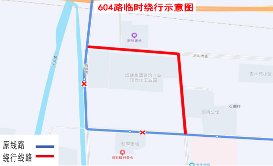 接相关部门通知,受西郊路与崔山大街交叉口封闭施工影响,即日起,604路临时绕行,具体方案如下: