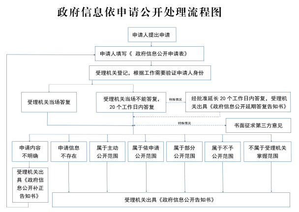 办理申请政府信息公开申请时,能够立即答复的,应立即答复;不能立即答复的,自收到申请之日起20个工作日内予以答复;确需延长答复期限的,延长答复时间不超过20个工作日,并告知申请人。政府信息涉及第三方权益的,应当征求第三方的意见,征求第三方意见所需时间不计算在期限内。依申请提供信息时,根据掌握该信息的实际状态进行提供,不对信息进行加工、统计、研究、分析或者其他处理。