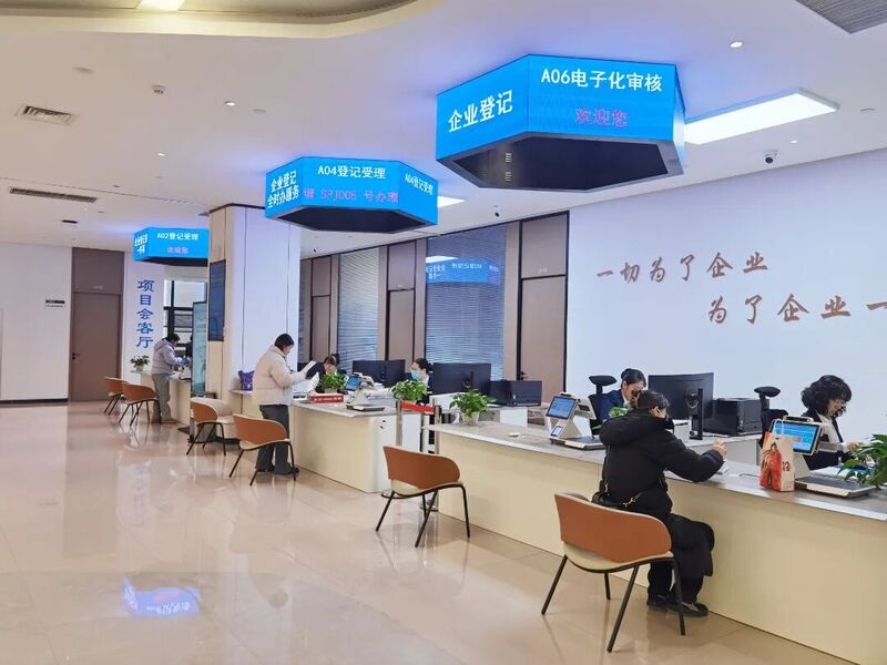 在政务服务窗口,工作人员正为前来办事的企业工作人员办理各项业务,该窗口集成企业设立、变更、注销等全链条标准化登记业务。一旁的增值服务窗口则提供法律、政策、商务、兜底等个性化衍生服务,目前已开设4个专窗,涵盖20余项服务事项。