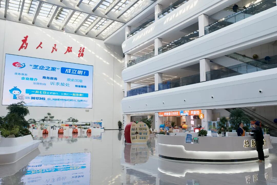 走进一楼的“芝企之家”综合服务区,明亮通透的办事区、清晰的指引标识、井然有序的功能布局映入眼帘,统一着装的工作人员在各区域有序地提供服务。