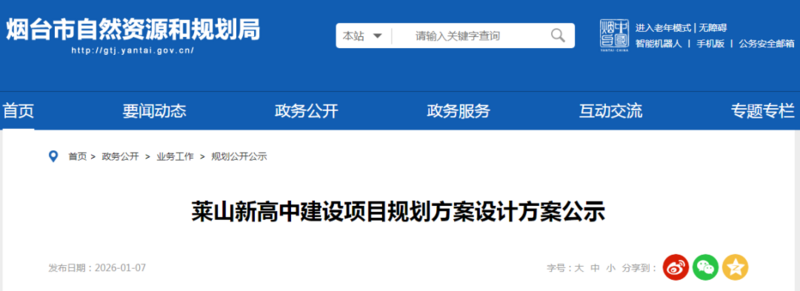 1月7日,全球网赌十大平台自然资源和规划局网站发布《莱山新高中建设项目规划方案设计方案公示》。